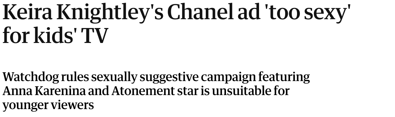 Now, how does the star of such a brand’s promotional materials factor? Where does Coco Mademoiselle, the role, begin? Knightley, the willowy English actress renowned for her turns in both mainstream juggernaut films, such as the Pirates of the Caribbean franchise and Love Actually, and smaller historical dramas, had the perfect star persona for CHANEL. She would have only been 22 or 23 when inking the initial deal, but touting a filmography replete with period piece, therefore symbolizing the combo of freshness and timelessness that the brand was so hinged upon. Knightley’s film star DNA was the same as Lagerfeld’s perception of CHANEL. Nicole Kidman embodied this too when she starred in 2004’s collaboration with Baz Luhrmann. In the 3 years prior to the ad, she had appeared in Moulin Rouge!, The Hours, The Others, Cold Mountain, Dogville, and The Stepford Wives - bridging both the big budget and the art house. Liu argues that her “association with CHANEL added a touch of Hollywood glamour to the brand and drew considerable attention” (Liu, 2). CHANEL next lined up director Jean-Pierre Jeunet and Audrey Tautou (both from beloved French film Amélie) for a Grand Tour-esque romp that saw Tautou finding love on the Orient Express. You could argue that Lagerfeld’s mission was to make CHANEL the IT girl personified, as Liu writes that his “collaborations with prominent figures in the fashion industry, such as models like Cara Delevingne and Lily-Rose Depp, brought a fresh and youthful perspective to CHANEL's image” (Liu 2). And in a way, he hit the jackpot with Coco Mademoiselle. Her cultural impact was so great that the ad was banned from children’s programming after playing before an Ice Age 2 screening due to sexually suggestive content (how’s that for a 00s flashback?).
